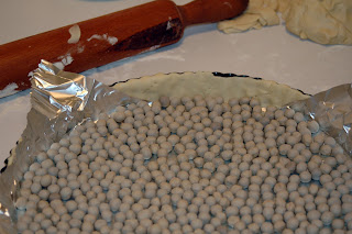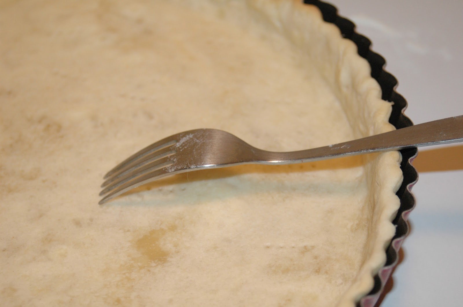 8.Esta masa hay que cocerla un poco en el horno antes de rellenarla, porque si no es muy fácil que nos quede cruda la masa, y cocido el relleno. Con un tenedor pinchar toda la masa (incluidos los bordes), y ponerle encima papel de aluminio (que cubra bien toda la base).