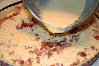 7.Sobre el bacon verter la mezcla de huevos, nata y queso. Y ayudarse de una espátula para repartilo de una forma regular.