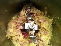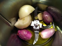 1.Poner en el vaso la cebolla, el ajo, las chalotas y el aceite. Picar 4seg, Vel.5. Bajar los restos de las paredes hacia el fondo del vaso