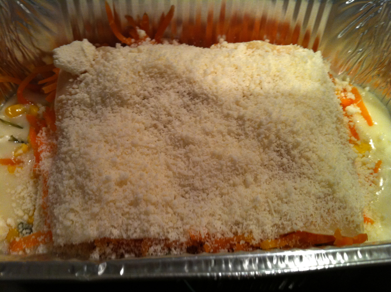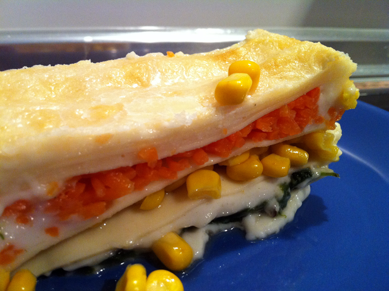 9.Para montar la lasaña, verter una fina capa de bechamel en la fuente de horno, y sucesivamente, las capas de lasaña, de espinacas con bechamel, de maiz, de zanahoria, y que queso, terminando con las epinacas, una última lámina de pasta.