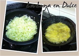 5.Mientras se va pochando la cebolla vamos friendo las patatas y sacándolas sobre papel absorbente para intentar que pierdan la mayor cantidad de aceite posible.