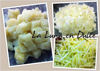2.Cortar las patatas paja, muy muy finas, y el bacalao en daditos de 1 o 2 cm más o menos y la cebolla la picamos muy fina.