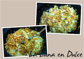 6.Cuando la cebolla ya esté completamente blanda, añadimos el bacalao y seguimos removiendo así como deshaciendo el bacalao según se va haciendo.