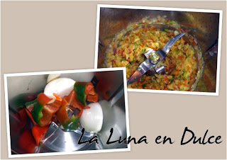 1-Ponga en el vaso la cebolla, el pimiento, la ñora y el ajo y trocee 3 seg/vel.5. Baje con la espátula los restos de verdura de la tapa y del interior del vaso hacia las cuchillas.