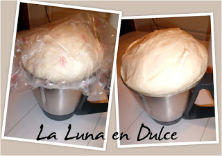 4.Dejar reposar la masa unos 30 minutos o incluso una hora tapado con papel film, para que doble su masa. (Eso que veis en la foto no es papel film, es un gorro de baño desechable que mi madre usa para estas cosas, y funciona a la perfección!! Je,je...)