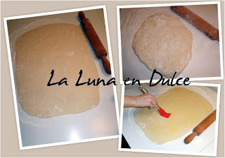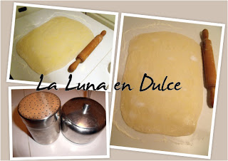 5.Enharinar ligeramente le superficie de trabajo y con la ayuda de un rodillo hacer un rectángulo con la masa de aproximadamente 1/2 centímetro de grosor.