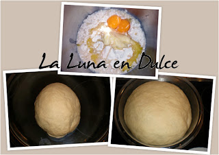 5.Pasado este tiempo, retiramos la masa y la ponemos en un recipiente amplio untado con una gota de aceite. Tapamos con papel film y dejamos así hasta que la masa haya aumentado el doble su volumen... más o menos 1 hora.
