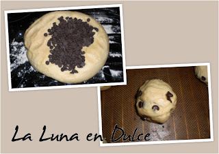 6.Cuando la masa haya doblado su volumen, retiramos la masa y le incorporamos las gotas de chocolate amasando suavemente.