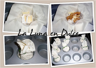 9.Ponemos los saquitos sobre la bandeja del horno o podemos utilizar la bandeja para muffins, y horneamos durante unos 15 o 20 minutos vigilándolos dado que es muy fácil que se queme la masa.