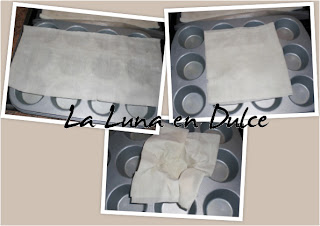 3.Utilizando los moldes para muffins damos forma a las pasta filo preparándola para rellenarla.