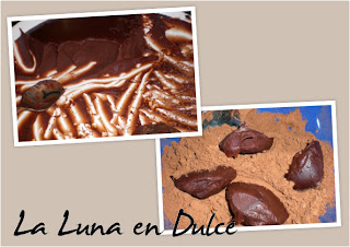 5.Al día siguiente y ya solidificado, tomar con una cucharita una porción y rebozar en el cacao, darle forma de bolitas como en la foto. Yo he utilizado dos cucharitas para dar la forma más redonda posible a las trufas, y luego... y pringarse las manos para rebozar y redondear bien.
