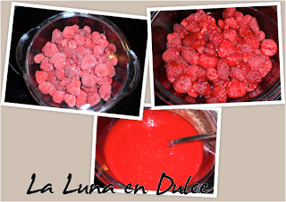 1.Hacer un puré con las frambuesas, y reservar. Yo he utilizado la thermomix, pero se puede hacer con cualquier batidora. En caso de utilizar frambuesas congeladas, simplemente hay que dejarlas descongelar a temperatura ambiente antes de hacerlas puré.