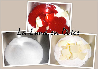 5.Añadir la mantequilla cortada en trocitos y el puré de frambuesas, y volver a batir hasta que quede una masa homogénea y esponjosa.