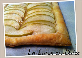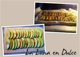 11.Hornear entre 15 o 20 minutos, cuando haya subido el borde de hojaldre alrededor de las manzanas, y éstas estén blandas con un ligero color.