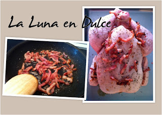 5.Cuando ya el bacon esté, retiramos la sartén del fuego. Retiramos el bacon de la sartén y lo introducimos directamente en el orificio del pollo, y un poco por encima del pollo.