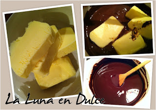 3.Cuando el chocolate este completamente derretido Y MUY CALIENTE, le agregamos la mantequilla y le damos vueltas hasta que este todo completamente incorporado. Reservar.