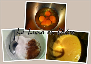 4.Poner en el vaso de la batidora los huevos, las yemas y la vainilla. Batir hasta que adquieran una textura esponjosa, de color pálido y hasta que hayan triplicado su volumen.