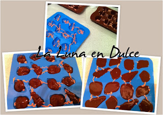 6.Verter este chocolate sobre los moldes ya "predecorados" y escurrir el exceso de chocolate de los moldes dejando que gotee de nuevo sobre el bol. Dejar enfriar en la nevera un ratito.