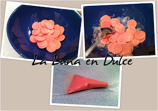 3.En un bol introducir los "Candy Melts" en el microondas a mínima potencia en tandas de 30 segundos, removiendo entre cada una de esas tandas para derretirlos sin quemarlos.