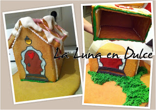 NOTA:A esta casita le hice una "base", y así poder hacer el jardín. Utilicé la mitad de la masa de mi receta de galletas de mantequilla, la estendí y la horneé. Una vez fría la pegué a la casa y decoré.