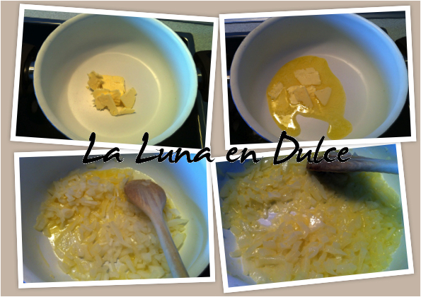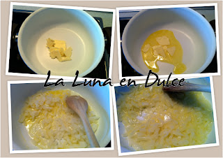 4.Incorporar el arroz y remover para que se impregne de la mantequilla, hasta que el arroz se vuelva trasparente.