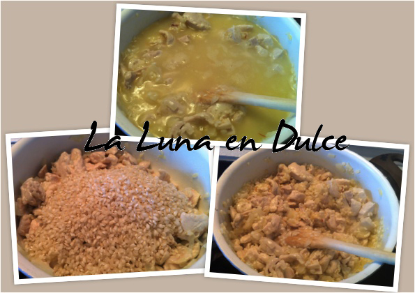 6.Mezclar el azafrán con 4 cucharadas del caldo de pollo bien caliente. Añadir esta mezcla al arroz y remover hasta que este absorvido por completo.