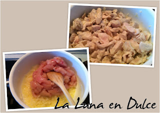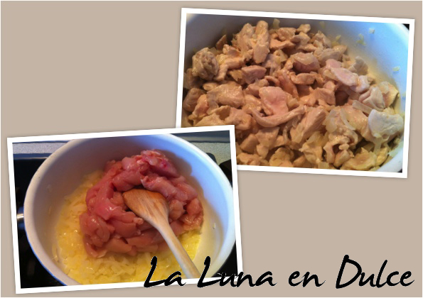 2.Cuando la cebolla ya esté blanda añadir el pollo y volver a remover.