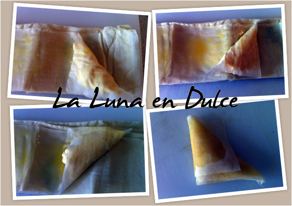 7.Poner una cucharadita del relleno de queso en una esquina, y juntarla con la esquina opuesta, formando así un triángulo.
