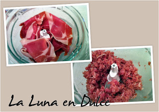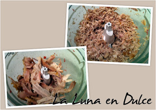7.Cuando pare la máquina dejar reposar unos minutos, y luego añadir el resto del jamón y el pollo picado, y mezclar bien unos segundos a una Velocidad alta, o con una espátula.