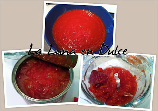 3.Introducir los tomates troceados en un robot de cocina junto con el concentrado de tomate, y triturar bien.
