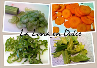 2.Mientras se van cociendo las alubias: picar fina la cebolla, pelar y cortar las zanahorias en rodajas finas, cortar la rama de apio y despepitar y cortar el pimiento verde.
