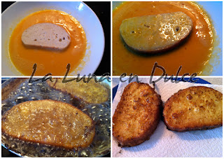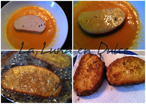 5.Cuando ya esté el aceite caliente, rebozamos las rebanadas de pan ya empapadas en el huevo batido y freimos, hasta que estén doradas por los dos lados.