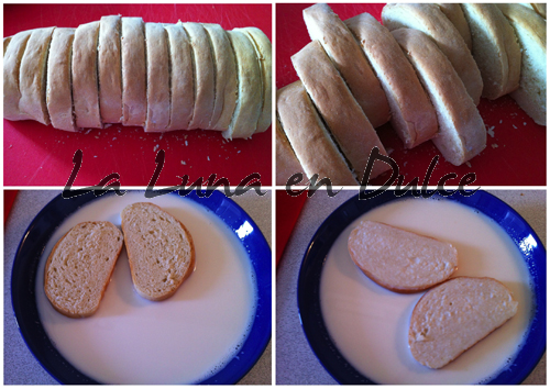 2.Cortar las rebanadas de pan al grosor deseado, y bañar las rebanadas con la leche muy caliente.