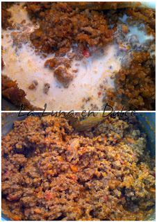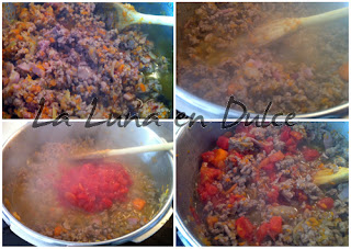 3.Subir el fuego, y agregar la carne y el bacon, y remover para soltar bien y evitar que se nos formen "pelotas" grandes de carne compactada. Lo haremos a fuego alto para que la carne se fría, y evitar que se cueza.