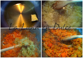 2.Poner al fuego la mantequilla y el aceite en una olla grande, a fuego medio alto. Cuando ya esté el aceite caliente agregar la cebolla, la zanahoria y el apio, y guisarlos hasta que empiece a estar la cebolla ya transparente.