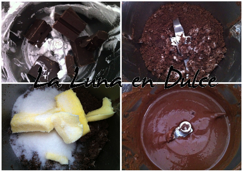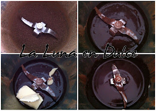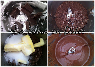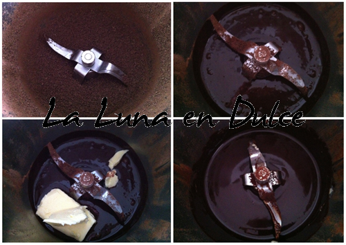 3.Agregar la mantequilla y el azúcar y programar 4min, 37º, Vel.2. Comprobar que el chocolate esté bien fundido y bajar los restos que hayan quedado en las paredes.