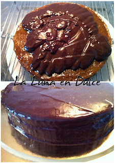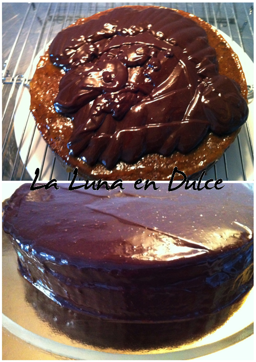 15.Colocar el bizcocho sobre una rejilla, y verter la cobertura caliente por encima, intentando cubrir toda la superficie para que quede lisa y brillante.