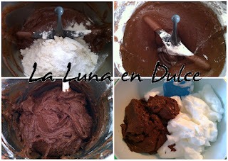 6.Verter la masa en el recipiente con el merengue reservado, y mezclar utilizando una espátula revolviendo de manera envolvente.