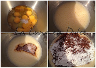 6.A continuación añadir el chocolate fundido, la harina, el cacao en polvo y la pizca de sal, mezclar suavemente, para no eliminar el aire que tiene la masa.