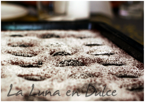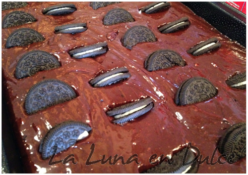 8.Verter la masa en el molde.9.Colocar las galletas partidas por la mitad, repartidas por toda la superficie.10.Introducir en el horno ya caliente, durante unos 20 o 25 minutos, nos debe quedar el centro ligeramente pegajoso.