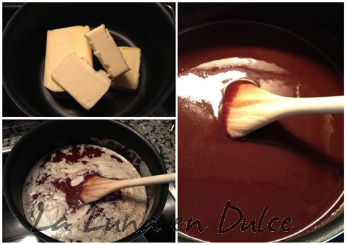 3.Agregar el chocolate troceado a la mantequilla y dejar SIN REMOVER durante unos minutos, pasados esos 5 o 10 minutos remover hasta que estén la mantequilla y el chocolate bien integrados.