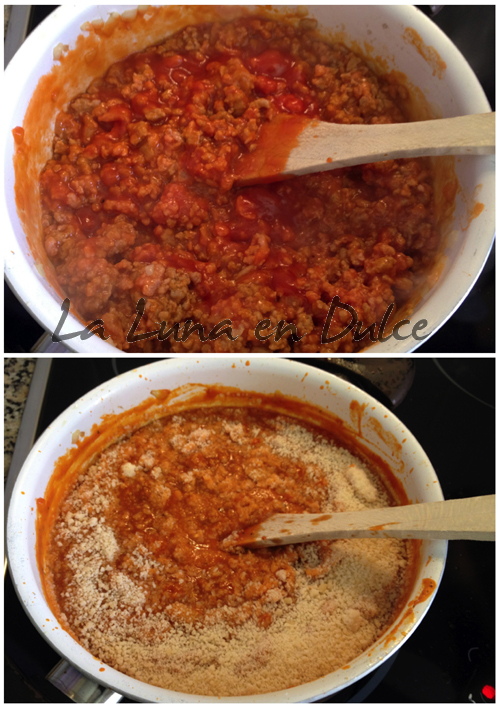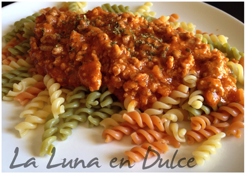 Tenía la carne picada recién comprada, y bueno, se me ocurrió hacer una "típica boloñesa", pero ahorrándome el tiempo de picar ajo y cebolla, y con el toque ideal del parmesano.