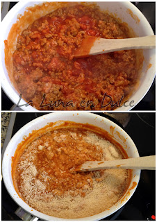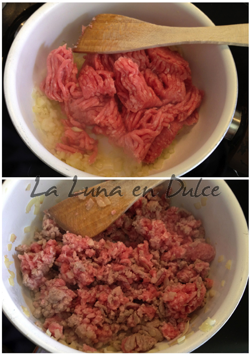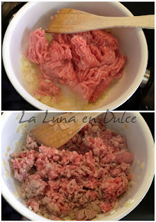 3.Agregar la carne picada, y desmenuzar mientras se va haciendo.