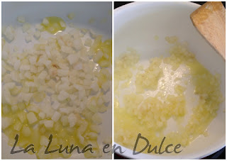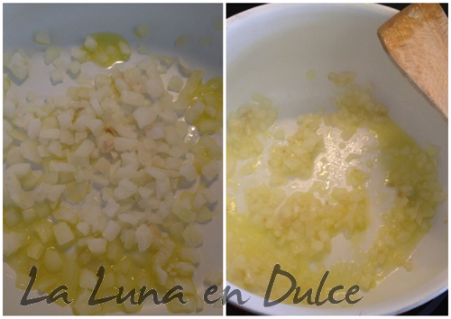 2.Agregar el ajo y el aceite, y remover hasta que la cebolla esté blanda, cuidado no se queme el ajo.