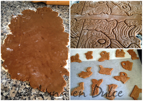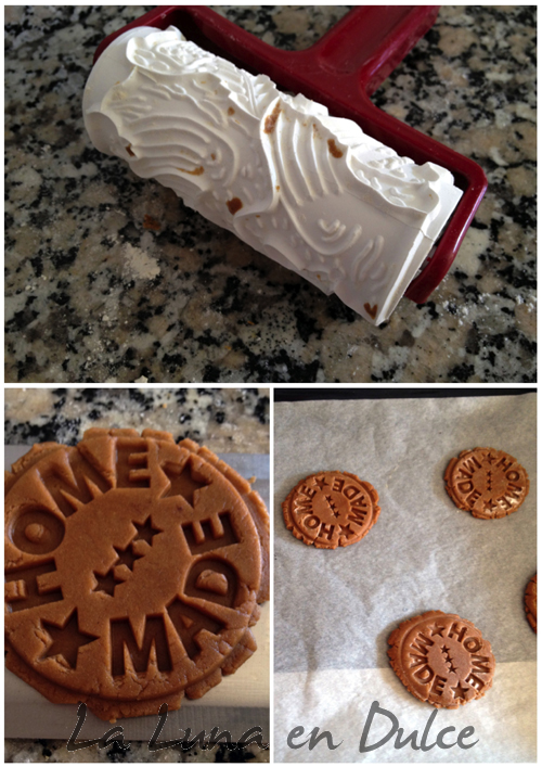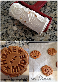 7.Pasado ese tiempo, espolvorear harina sobre la superficie de trabajo, y con la ayuda de un rodillo de cocina estirar, y cortar las galletas con nuestro corta pastas favorito. En este caso Yo utilicé dos, un rodillo que deja galletas con forma de animales y duendes, y por otro lado el sello de "HOME MADE" que tanto me gusta.
