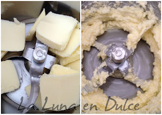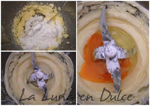 2.Incorporar el azúcar glass, y batir unos 15seg.Vel.4-5, para obtener una masa homogénea.