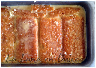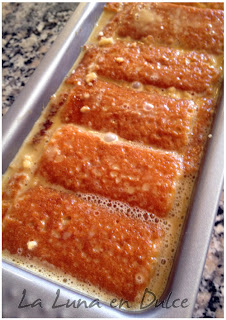 8.Verter con cuidado sobre los sobaos. Cuando vertamos el líquido en el molde los sobaos saldrán a flote, así que no os asustéis, lo único que hay que hacer es con la ayuda de un tenedor recolocar los sobaos "nadadores" para que hagan de base de la tarta al desmoldar.