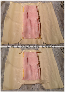3. En el centro del hojaldre colocar lonchas de pavo y queso al gusto, este será nuestro relleno de la trenza.