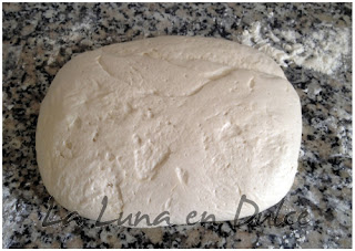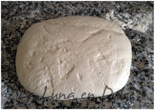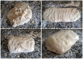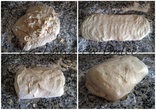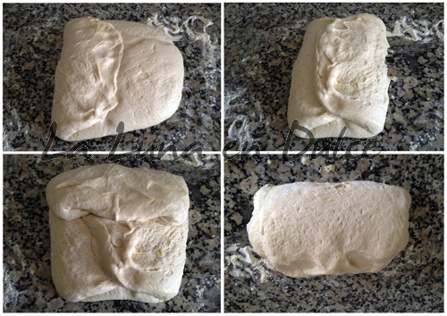 5.Golpear la masa un poco hasta formar un rectángulo. Dejar reposar un par de minutos y hacer el primer "folding" (Os dejo aquí el enlace que puso Eva para ver que eso del folding), que viene siendo un método de estirado y doblado de la masa.