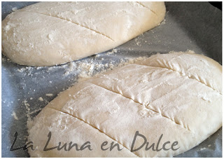 5.Mientras, precalentar el horno a 230º, y coloca en su interior una pequeña con agua para generar vapor. Hacer unos cortes en los panes.